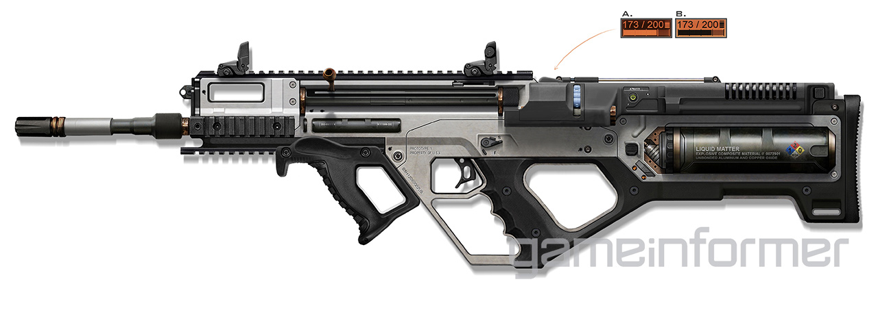 Un arma equipada en su interior con una impresora 3D que le permitirá imprimir su propia munición, reduciendo así notablemente el tiempo de recarga. En este sentido, este rifle requerirá de unos cartuchos de líquido especial, con el que el arma dará forma a sus balas.